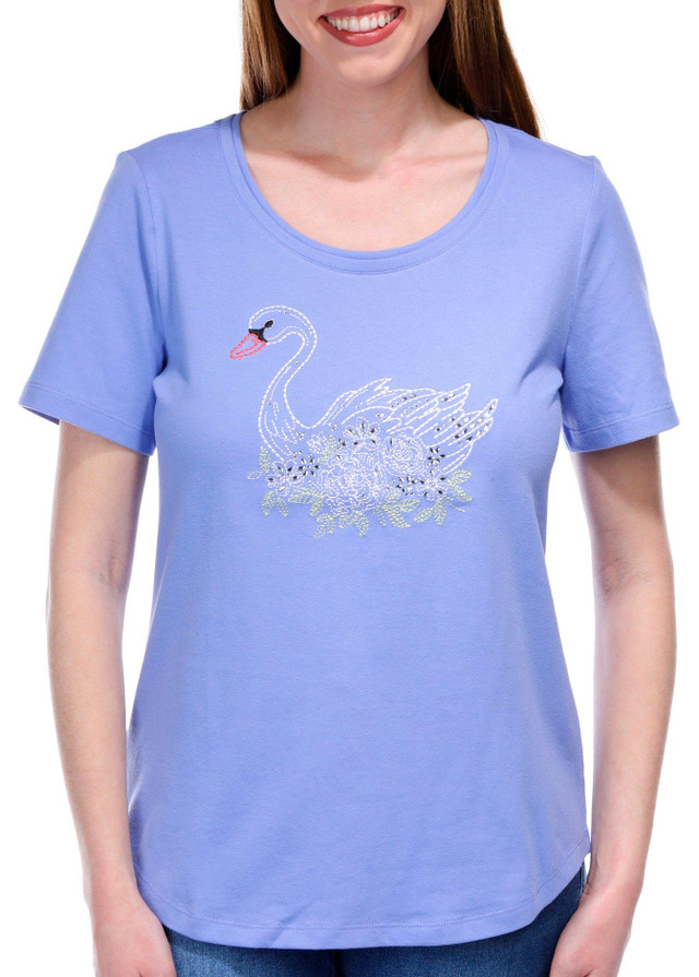 Introducing our Women's Embroidered Swan Short Sleeve Top, crafted from a blend of cotton and polyester for a soft and comfortable feel. This elegant top features a beautifully embroidered swan design with rhinestone accents, adding a touch of sparkle to your outfit. The short sleeves and round neckline offer a classic and relaxed fit, making it perfect for any casual occasion. Elevate your wardrobe with this stylish and unique piece.
