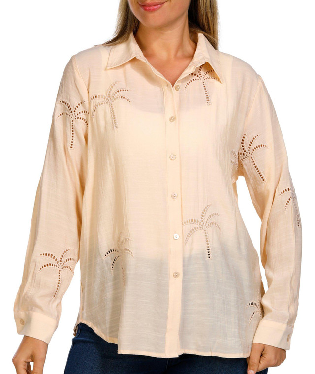 Stay effortlessly stylish in this womens long sleeve embroidered button-down top. Crafted from lightweight fabric, it features a solid color, classic collared neckline, and elegant embroidery for a refined touch. Perfect for layering or wearing solo.