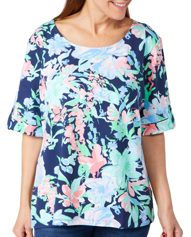 Introducing the Women's Painted Floral Elbow Sleeve Top, crafted from a blend of cotton and spandex for a comfortable and flexible fit. This stylish top features a beautiful floral design, short sleeves, and a round neckline for a classic look. With a 25-inch length, it's perfect for adding a touch of elegance to your everyday wardrobe. Ideal for casual outings or garden parties!