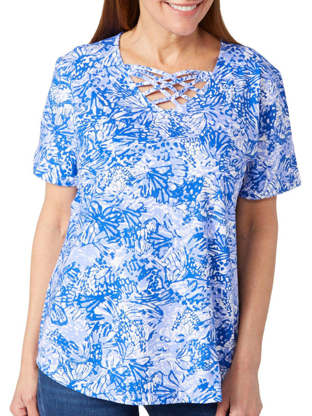 This Print Crisscross Short Sleeve Top offers a perfect blend of style and comfort. Crafted from a soft 95% cotton and 5% spandex fabric, it provides a breathable, stretchy fit. The crisscross neckline adds a trendy, flattering touch, while the print design brings a pop of personality. With a 24-inch length, this top is ideal for casual outings or everyday wear, combining ease and elegance effortlessly.