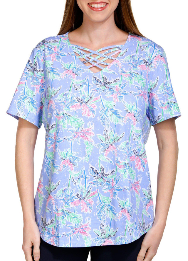 The Womens Print Crisscross Short Sleeve Top offers a perfect blend of style and comfort. Crafted from a soft 95% cotton and 5% spandex fabric, it provides a breathable, stretchy fit. The crisscross neckline adds a trendy, flattering touch, while the print design brings a pop of personality. With a 24-inch length, this top is ideal for casual outings or everyday wear, combining ease and elegance effortlessly.