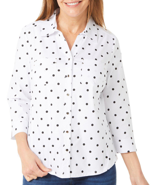 This womens 3/4 sleeve button-down top is a versatile addition to your wardrobe. Featuring a stylish print, it offers a chic yet casual look thats perfect for layering or wearing on its own. The 3/4 sleeves provide a flattering fit, while the button-down design adds a touch of classic sophistication. Ideal for any occasion, this top offers both comfort and style. Measures approximately 24 in. Fabrication is 67% cotton, 29% polyester, and 4% spandex.
