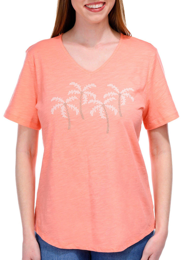 Introducing the Women's Seed Palm V-Neck Top, crafted from 100% cotton for ultimate comfort. This stylish top features a heathered exterior and a beautiful beaded palm design on the chest. With short sleeves and a 25-inch length, it offers a relaxed yet chic look perfect for any casual outing. Combining fashion and comfort, this top ensures you stay stylish and comfortable throughout your day.