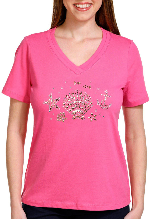 Embrace seaside vibes with this Women's Short Sleeve Embellished Sea Shell Tee. Made from a soft and durable 60/40 cotton-polyester blend, this tee offers all-day comfort with a touch of elegance. The front features beautiful sea shell embellishments that bring a hint of coastal charm to your wardrobe. Top length measures approximately 24 in.