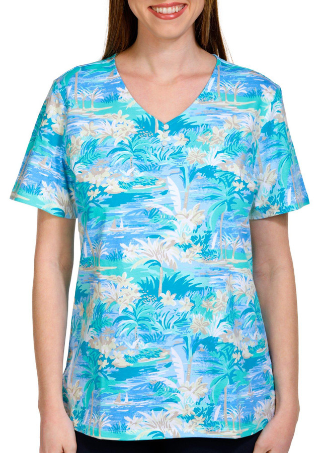 Coral Bay Womens Short Sleeve Four Palms V-Neck Top