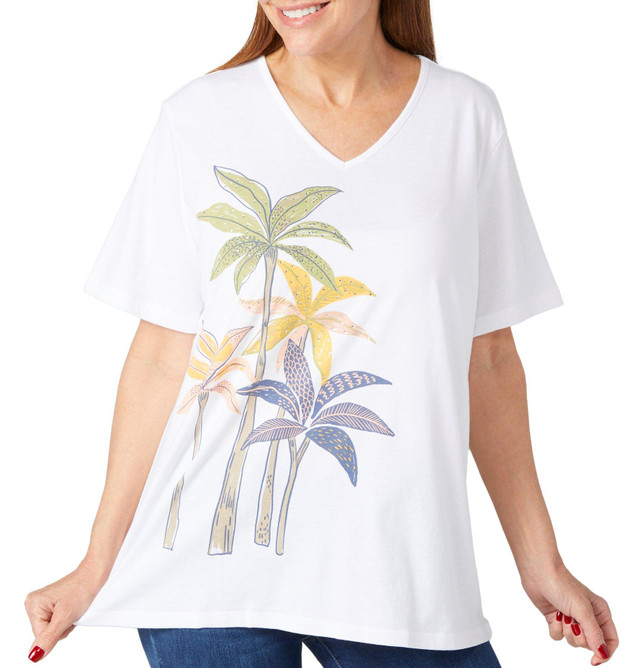 Introducing the Women's Short Sleeve Four Palms V-Neck Top, crafted from a blend of cotton and polyester for ultimate comfort. This stylish top features a vibrant palm tree graphic design adorned with sparkling rhinestone embellishments. With short sleeves, a flattering v-neckline, and a 26-inch length, it's perfect for adding a touch of tropical flair to your wardrobe. Ideal for casual outings or beach days!