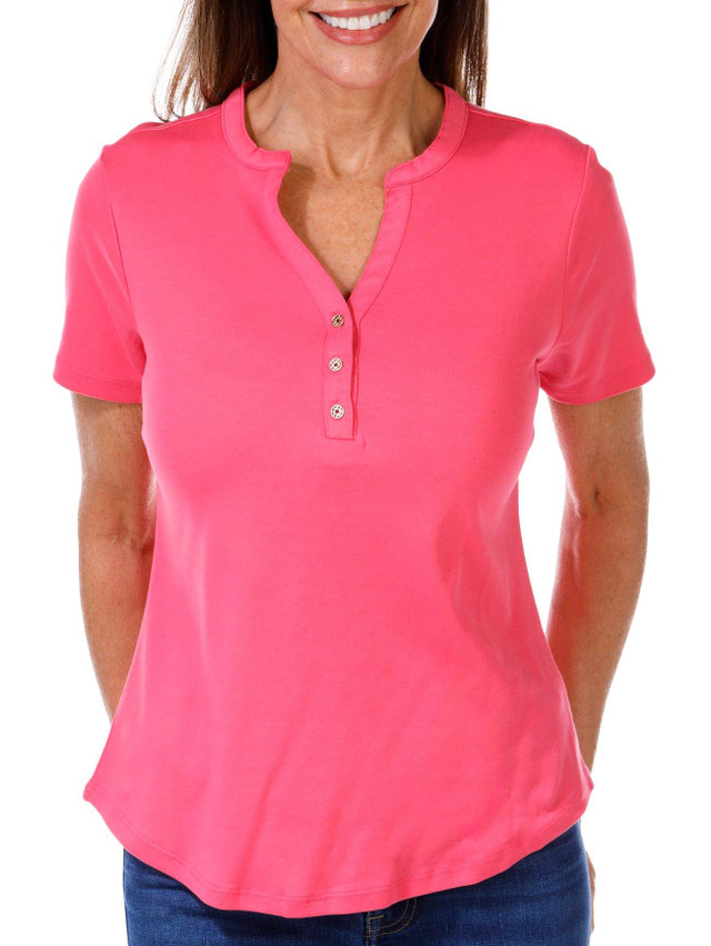 Casual comfort meets timeless style in this Womens Solid Short Sleeve Henley Top. Made from 100% cotton for a soft, breathable feel, it features a classic Henley neckline with button detailing that adds a touch of laid-back charm. The top approximately measures 26 inches in length, offering easy coverage and a flattering fit. Features include short sleeves and a smooth silhouette that pairs effortlessly with jeans, shorts, or skirts for everyday versatility.