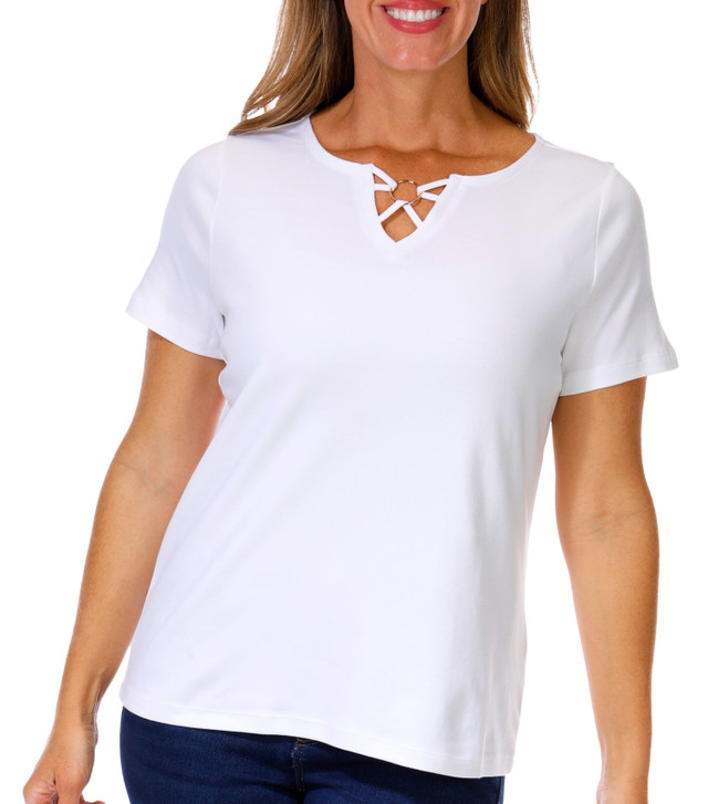 Coral Bay Womens Short Sleeve Sweetheart Metal Ring Top