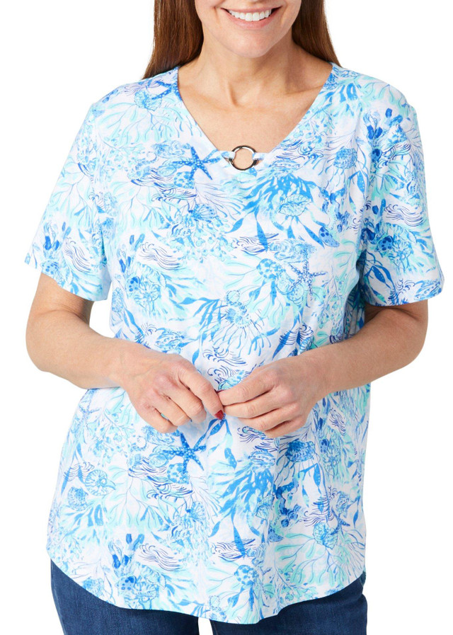 Dive into style with our Women's Short Sleeve Under Sea V-Neck Top. Crafted from a comfortable blend of cotton and spandex, this top features a vibrant under-the-sea themed print. The v-neckline with a chic ring accent adds a touch of elegance, while the short sleeves and 25-inch length ensure a flattering fit. Perfect for any casual outing, this top combines comfort and style effortlessly.