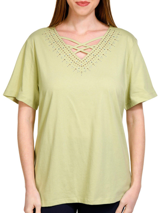 Add a touch of glamour to your wardrobe with the Womens Embellished Short Sleeve Top, designed for both comfort and style. Made from a blend of 60% cotton and 40% polyester, this top offers a lightweight, breathable feel with lasting durability. The exquisite embellishments elevate the design, adding a hint of sparkle and sophistication. Whether you're dressing up for a special occasion or adding flair to your casual look, this versatile top is the perfect choice to make you shine effortlessly.