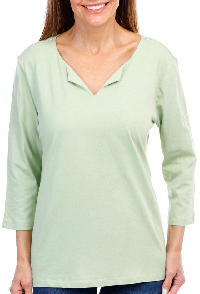 This 3/4 sleeve top features a solid color design on soft lightweight knit fabric, split neckline, and classic styling. The top length measures approximately 26 in.