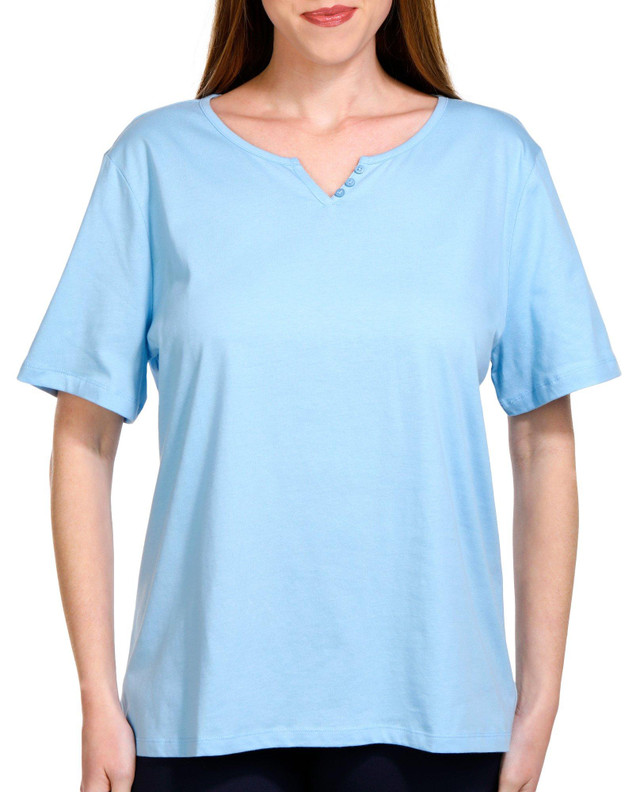Enhance your everyday style with our Women's Split Neck Button Top. Crafted from 100% cotton, this top offers both comfort and breathability. The stylish solid color is perfect for versatile pairing, while the short sleeves and split neckline with triple button detail add a touch of elegance. With a 25-inch length, this top is ideal for casual wear or dressing up for a special occasion.