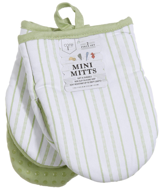 Introducing our 2 Piece Striped Mini Oven Mitts, expertly crafted from 100% cotton for a combination of style and protection. Each mini mitt measures 7 by 5.5 inches, providing a comfortable and secure fit for your hands while handling hot cookware. Designed with heat resistance up to 392 degrees, these mitts ensure your safety during all your cooking and baking endeavors.