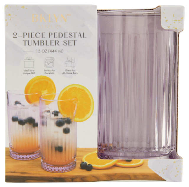 Introducing the 2 Pk Pedestal Glass Tumblers, perfect for enjoying chilled beverages and cocktails. These elegant tumblers feature a vintage-inspired design that will elevate your bar cart. Ideal for both everyday use and special occasions, they combine style and functionality to enhance your drinking experience. 15 FL OZ capacity each.