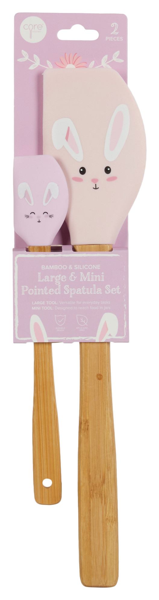 This 2 pack of Easter bunny pointed spatulas includes one large and one mini size, each with a silicone end and a bamboo handle. Cute and functional, they are perfect for mixing, spreading, and adding a festive touch to spring baking.