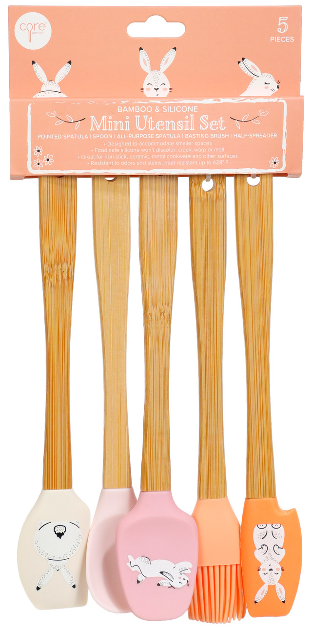This five piece Easter Bunny mini utensil set features a charming mix of wood handles and silicone heads decorated with festive bunny designs. The set includes a pointed spatula, spoon, spatula, brush, and half spreader, making it both decorative and functional for baking, cooking, or seasonal entertaining. Each utensil measures approximately 8.5 in long.