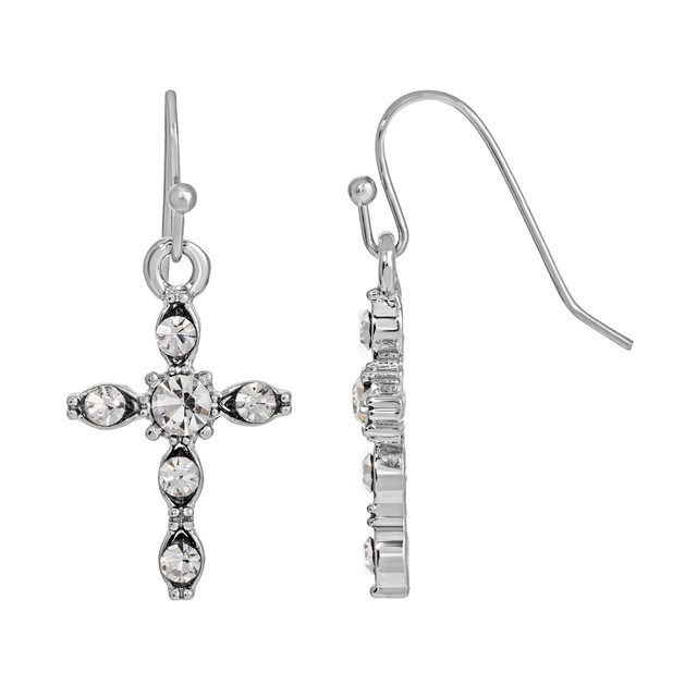 These dainty and elegant crystal cross drop earrings feature round-cut crystals and a fishhook back, available in both gold-tone and silver options. Perfect for adding a touch of inspiration to any outfit, their delicate design makes them ideal for everyday wear or special occasions. Length 1.1 in., width 14mm.