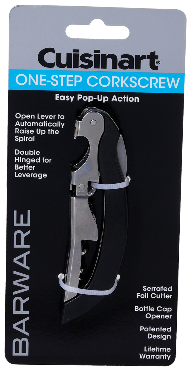 Enjoy wine with ease using the One Step Corkscrew. The open lever automatically raises the spiral, while the double-hinged mechanism delivers extra leverage for quick, effortless cork extraction. A reliable tool for every kitchen or bar.