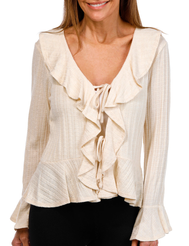 Cupio Womens Long Bell Sleeve Tie Front Ruffle Cardigan