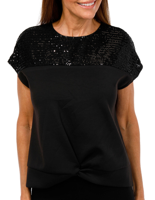 Add sparkle to your style with the Womens Short Sleeve Sequin Twist Front Top. Featuring a sleek solid color and a chic twist-front design accented with shimmering sequins, this top is perfect for nights out or festive occasions. Top length measures 22 inches. Fabrication 94% polyester, 6% spandex