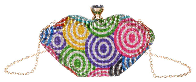 This womens clutch is shaped like a kiss and features a bright spiral bedazzled design with a snap closure. A detachable chain allows it to be worn as a shoulder bag, adding playful sparkle and fun to any outfit. Measures approximately 8.5 in x 5 in x 2.5 in.