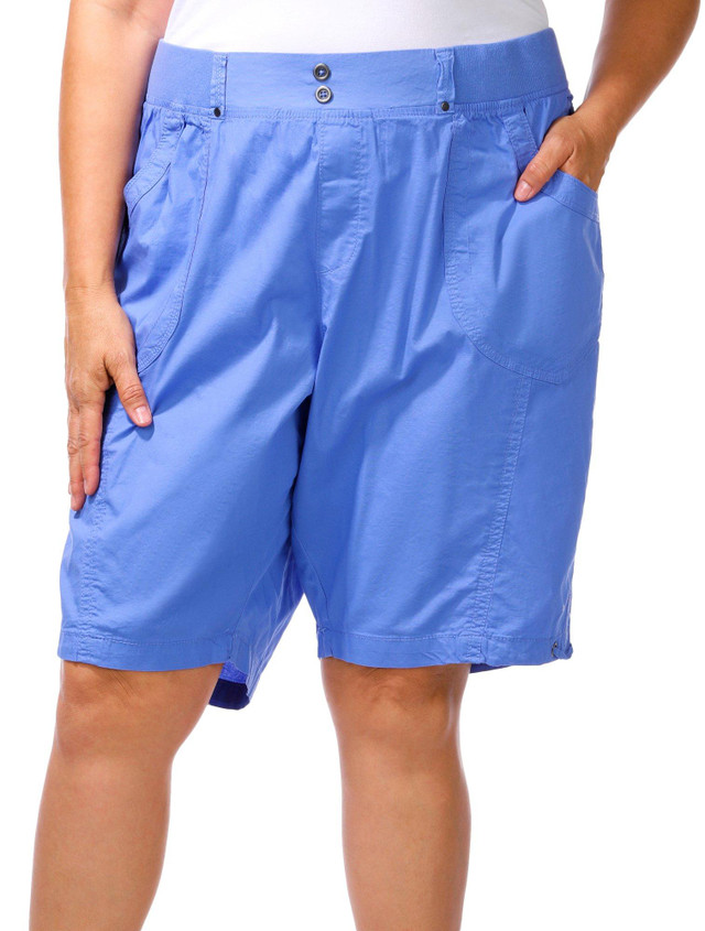 These pull-on shorts feature a solid color design on lightweight woven fabric, an elastic waistband, two front pockets, two back pockets, and a grommet strap hem. The inseam measures approximately 10 in. Fabrication 98% cotton, 2% spandex.