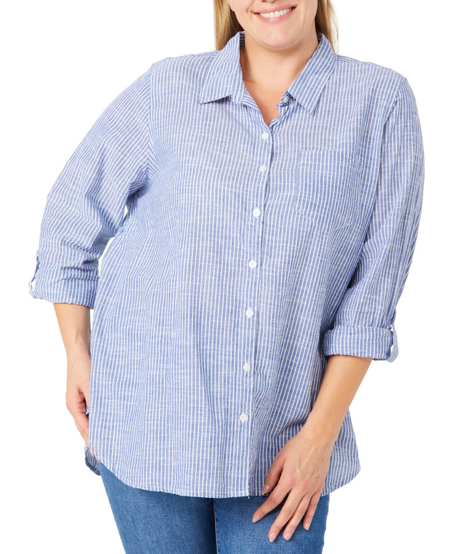 This plus size 3/4 sleeve button down top features roll tab sleeves and a soft cotton fabric for comfort. The striped pattern adds classic style, making it perfect for casual or layered outfits. Top length measures approximately 31 in. Fabrication is 100% cotton.