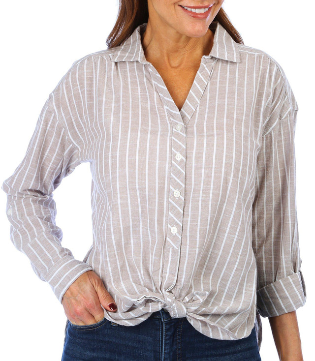 This women's striped button-down top is a perfect blend of style and comfort. Made from 100% cotton, it features a chic striped design and a front tie detail for a trendy touch. The roll-tab sleeves and collared neckline add to its versatile appeal, making it ideal for both casual and semi-formal occasions. This top ensures you look effortlessly stylish while staying comfortable.