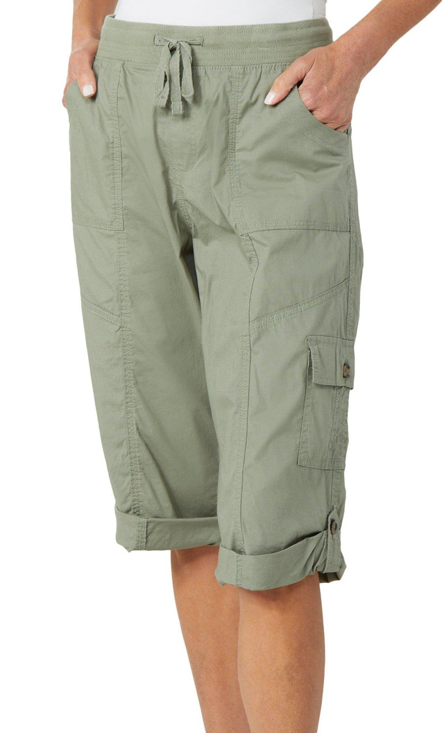 Effortlessly stylish and functional, the Women's Suzanne Capris feature a comfy drawstring pull-on waistband, front, back, and cargo pockets for all your essentials, plus adjustable leg rolls for versatile wear. With a 15-inch inseam, these capris are perfect for everyday comfort and casual flair. Fabrication is 98% cotton and 2% spandex.