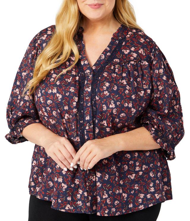 Embrace a blend of comfort and style with the Plus 3/4 Sleeve Floral Top. Crafted from 100% cotton, this top showcases a cute floral print and a charming ruffle collar. The button-down front adds a classic touch, while the crochet detail on the 3/4 sleeves enhances its feminine appeal. Perfect for any casual outing, this top offers a delightful mix of elegance and ease. Top length is 26 inches.