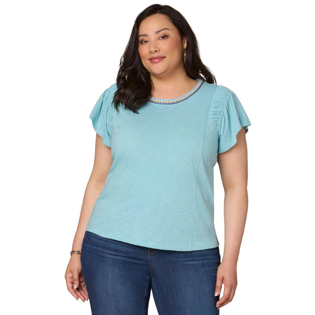 Give your everyday wardrobe a refresh with this must-have staple knit tee in plus sizing. Its designed with short sleeves, ruched armholes, an intricate crochet scoop neck, seaming details, and a slightly sheer fabric. 60% cotton, 40% modal. Front length approx. 27 1/2 in. Back length approx. 26 1/4 in.