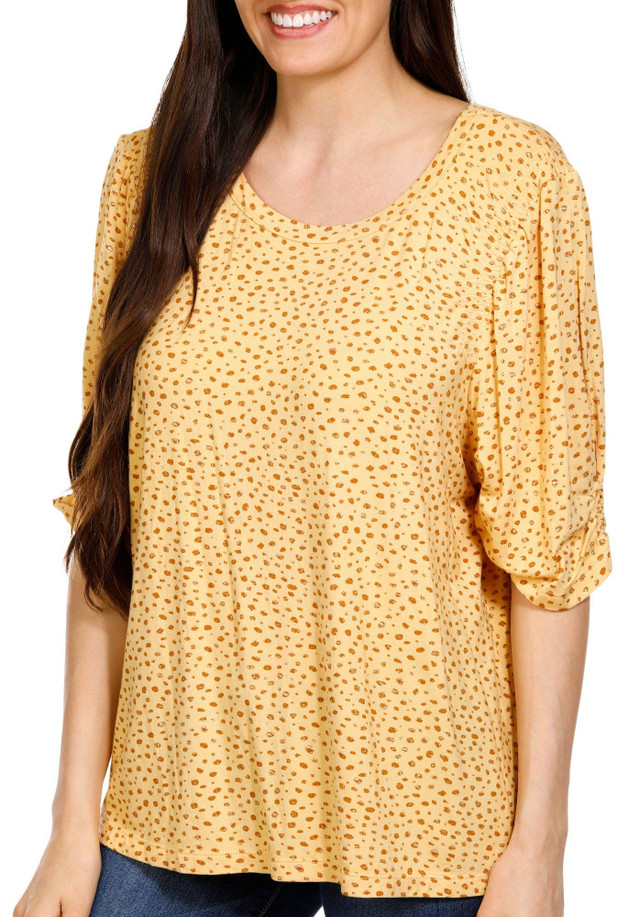Introducing this 3/4 Sleeve Top, a stylish and eye-catching addition to your wardrobe. This top features ruched elastic sleeve details that add a touch of elegance and flair. The dot print with metallic stitching creates a playful yet sophisticated look, making it perfect for both casual and semi-formal occasions. Fabrication is 95% rayon and 5% spandex.