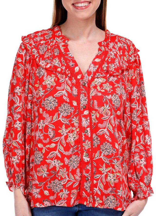 This woven top is perfect for the transition between seasons. It features three quarter blouson sleeves, a crochet-lined V-neck, button front, floral print, and all the ruffles. Top length measures approximately 24.5 in.
