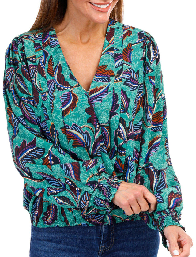 Show off your on-trend fashion sense with this woven tops pop of emerald teal and fun abstract leaf print. It has long blouson sleeves, smock cuffs, an overlap front V-neck, and a cased hem that prevents bulk. Top length measures approximately 22 in.