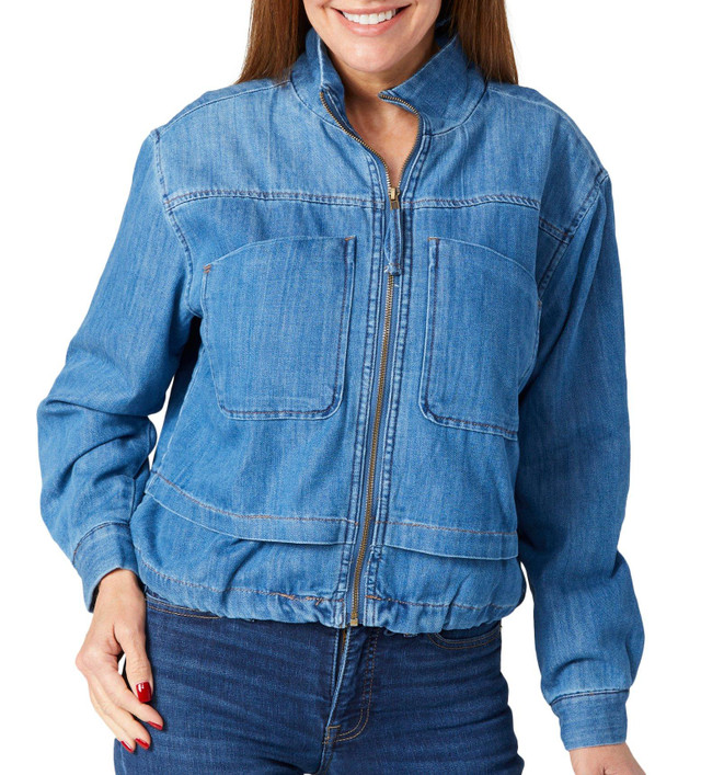 Layer up into spring in this zip front jacket, designed with long snap sleeves, a high neck, angled chest pockets, back vent, and a double layer design. Its soft, drapey denim provides a timeless, cool vibe wherever you go. Top length measures approximately 23 in. Fabrication is 63% cotton, 26% polyester, 11% rayon.