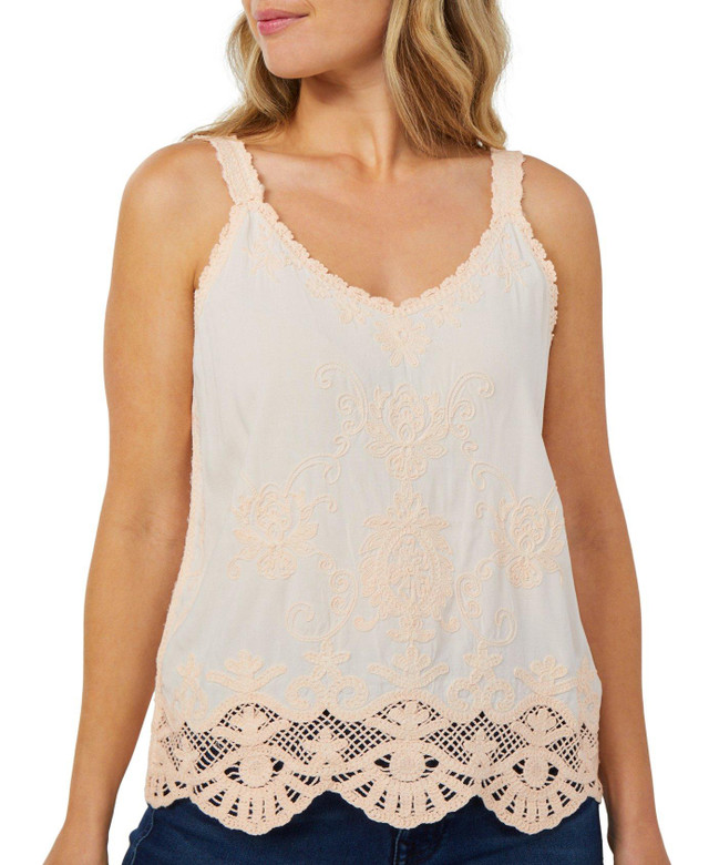 Smooth and endlessly versatile, this woven tank top is a warm weather essential and an effortless base for any number of ensembles. With eye catching crochet scallop edges, a V neck, and chic embroidery, its a wardrobe must have. Top length measures approximately 20.5 in.