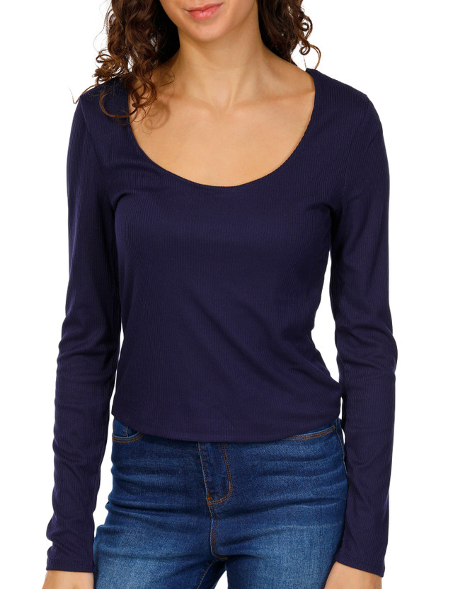Upgrade your outfits with this simple and stylish long sleeve top! It features a ribbed fabric, scoop neckline, and a washed-style solid color design. The styling opportunities are endless! Fabrication is 92% polyester and 8% spandex.