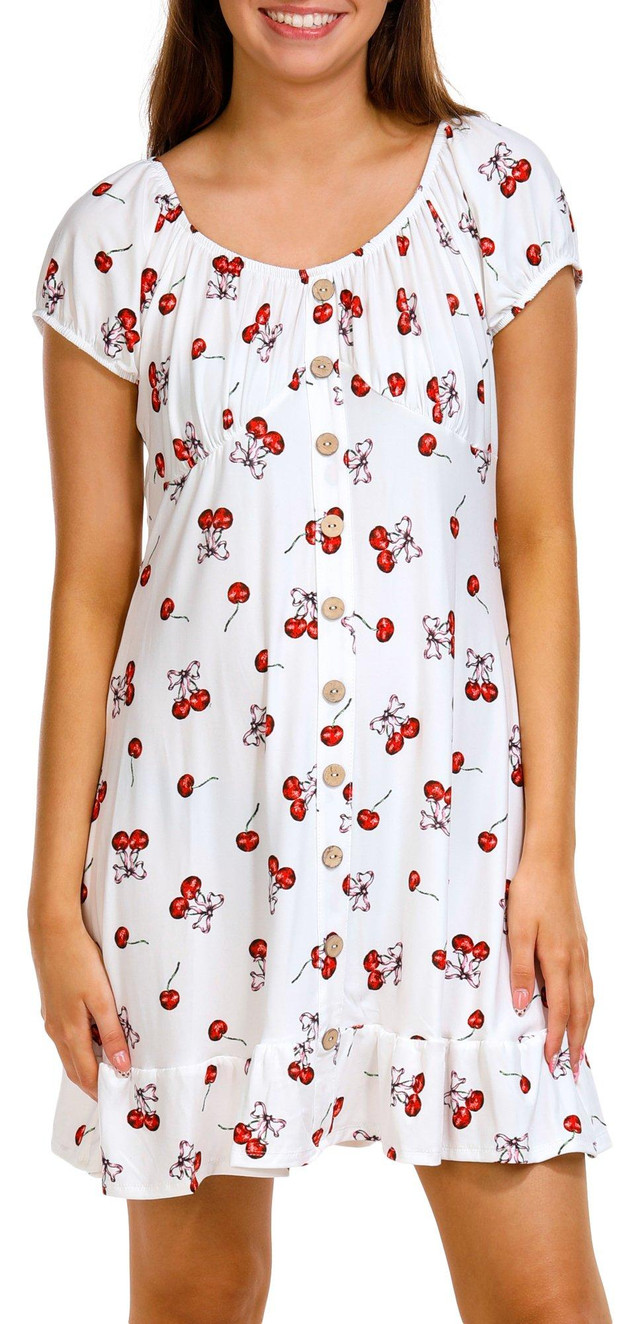 Brighten your wardrobe with the Juniors Short Sleeve Cherry Print Dress. Made from a blend of polyester and spandex, this dress features a cute cherry and bow print, along with short sleeves for a charming look. The button-down detail and ruffle hem add a playful touch, while the 28-inch length ensures a trendy and comfortable fit. Perfect for any occasion, this dress combines style and ease effortlessly.