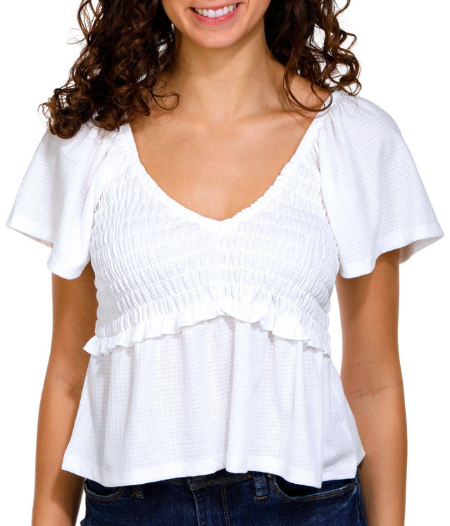 The Juniors Smocked Peplum Top is a chic and versatile addition to any wardrobe. Made from a blend of polyester and spandex, this top offers a comfortable and flattering fit. Featuring a stylish solid color, short ruffle sleeves, and a smocked chest, it adds a touch of elegance to any outfit. The v-neckline and 19-inch length make it perfect for pairing with jeans or skirts, ideal for both casual and dressy occasions. Fabrication is 93% polyester, 7% spandex.