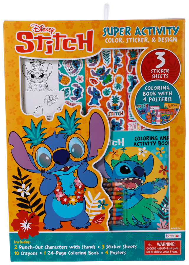 Unleash creativity with the Stitch Super Activity Set! Color, sticker, and design with 2 punch-out characters and stands, 3 sticker sheets, 10 vibrant crayons, a 24-page coloring book, and 4 posters. Perfect for hours of fun and imagination! Ages 3+