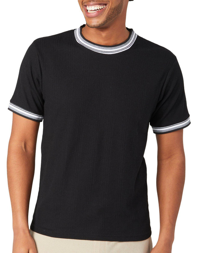 The Short Sleeve Tee, crafted from luxurious jacquard knit fabric, is a stylish addition to any wardrobe. Featuring subtle striped accents, this tee effortlessly combines modern design with timeless appeal. Its soft, breathable material ensures all-day comfort, making it perfect for casual outings or relaxed evenings. Elevate your everyday look with this versatile piece that adds a touch of sophistication to any ensemble. Fabrication is 55% cotton, 45% polyester.