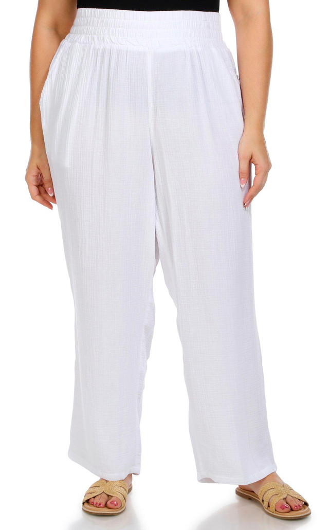 These plus size gauze pants feature a solid color with a 29 inch inseam, elastic waistband, and side seam pockets. With a straight leg fit and lightweight feel, they are perfect for relaxed days and casual comfort. Fabrication 100% cotton