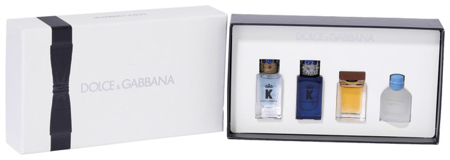Delight any fragrance lover with the Mens 4Piece Mini Fragrance Set, featuring four mini bottles: K Pour Homme Eau De Toilette and Eau De Parfum, The One Pour Homme Eau De Toilette, and Light Blue Pour Homme Eau De Toilette. Perfect for sampling, travel, or layering your signature scent. A stylish and thoughtful gift. Made in Italy.
