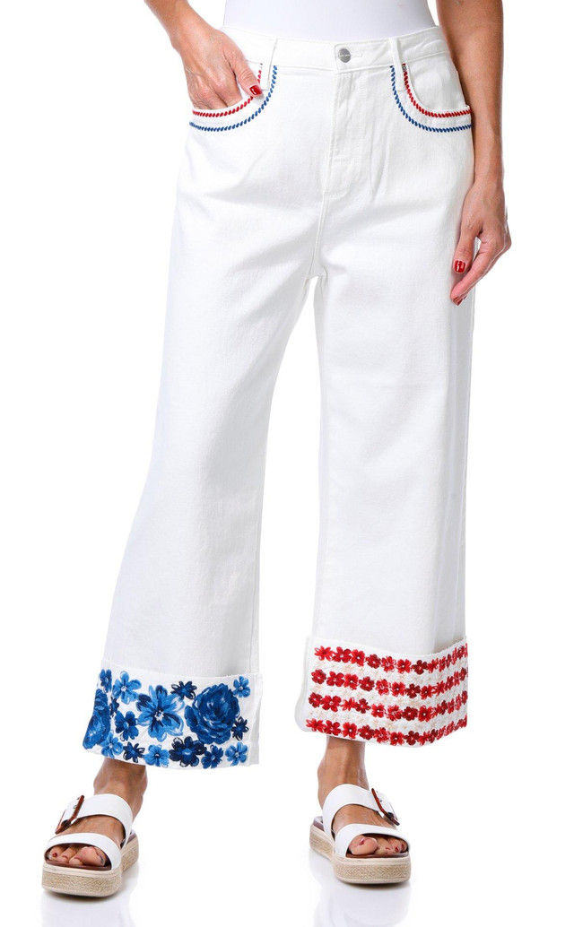 Step into summer charm with these white Driftwood pants, styled with a 5-inch reverse cuff adorned in patriotic floral embroiderytwo blue blossoms and one red bloom that add a subtle Americana touch. Delicate stitching traces the edges of both front and back pockets, echoing the florals with graceful flair. Perfect for sunny outings, they blend standout detailing with everyday comfort and a flattering fit.