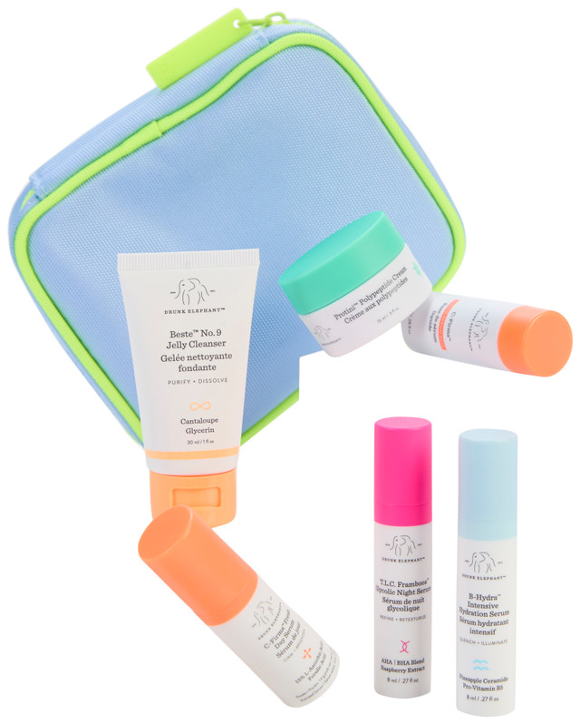 Drunk Elephant's The Littles Travel Skincare Kit is a set of six travel-friendly a.m. and p.m. essentials that cleanse, exfoliate, hydrate, brighten, replenish, and protect skin, resetting it to a healthy state. Formulated without: Essential Oils, Drying Alcohols, Silicones, Chemical Sunscreens, Fragrances and Dyes, SLS.