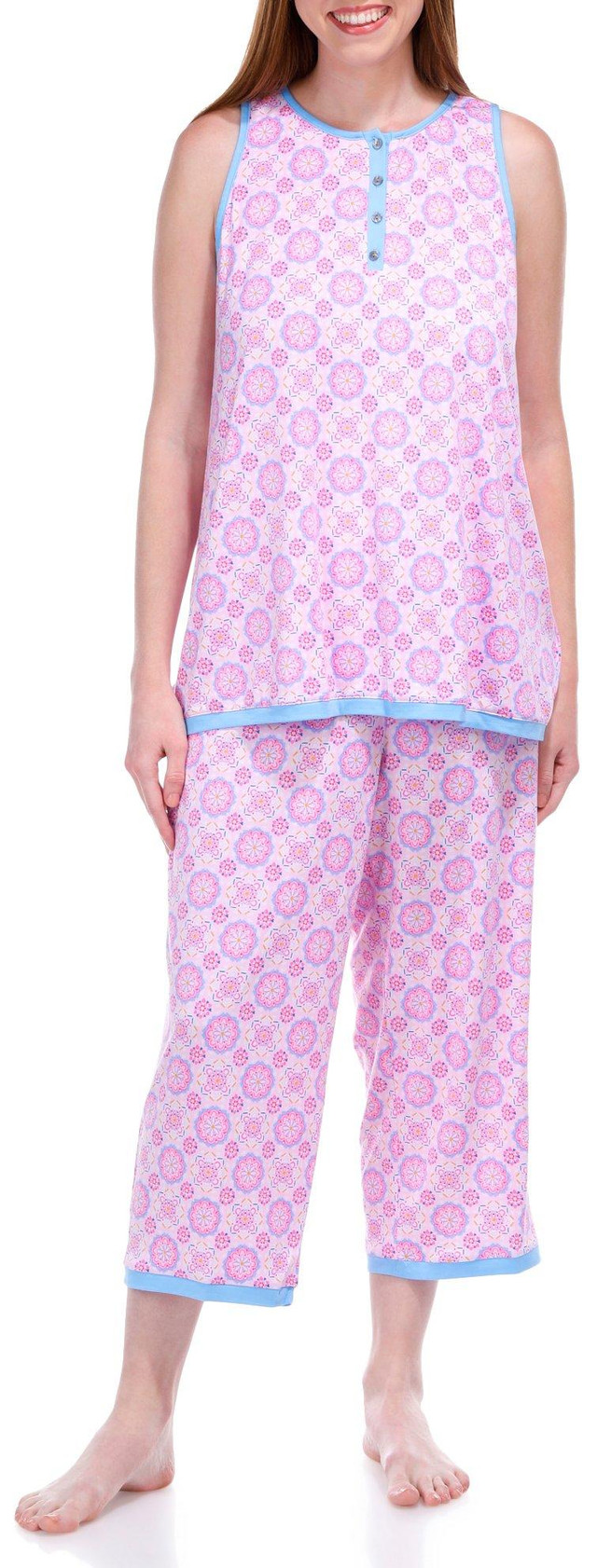 Introducing the Women's 2 Pc Paisley Pants Sleepwear Set, crafted from a soft blend of rayon and spandex. This elegant set features a stunning mandala flower print, adding a touch of serenity to your nighttime routine. The tank top pairs seamlessly with the matching pants, offering both comfort and style.