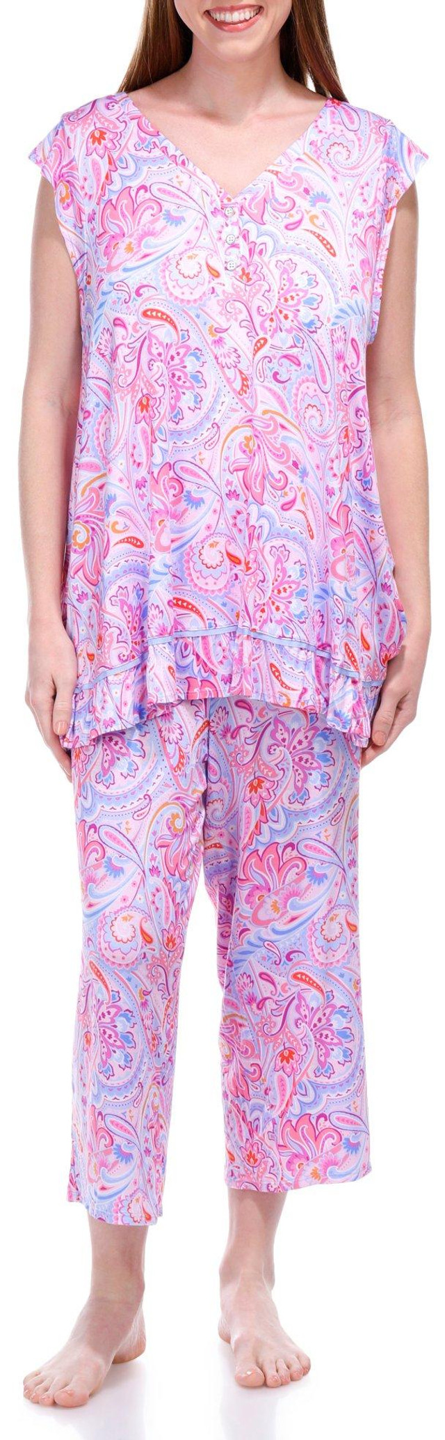 Introducing the Women's 2 Pc Paisley Print Pants Sleepwear Set, crafted from a soft blend of rayon and spandex. This set features a stylish paisley print, adding a touch of elegance to your nighttime routine. The short sleeve top pairs seamlessly with the matching pants, offering both comfort and sophistication. Perfect for lounging or sleeping, this set combines beauty and ease, making it a delightful addition to your sleepwear collection.