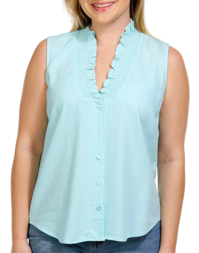 This blouse features solid color design on woven fabric, flutter sleeves, button down styling, a v-neckline, ruffle details, and a relaxed fit. The top length measures approximately 25 in. Fabrication is 55% linen, 45% viscose.