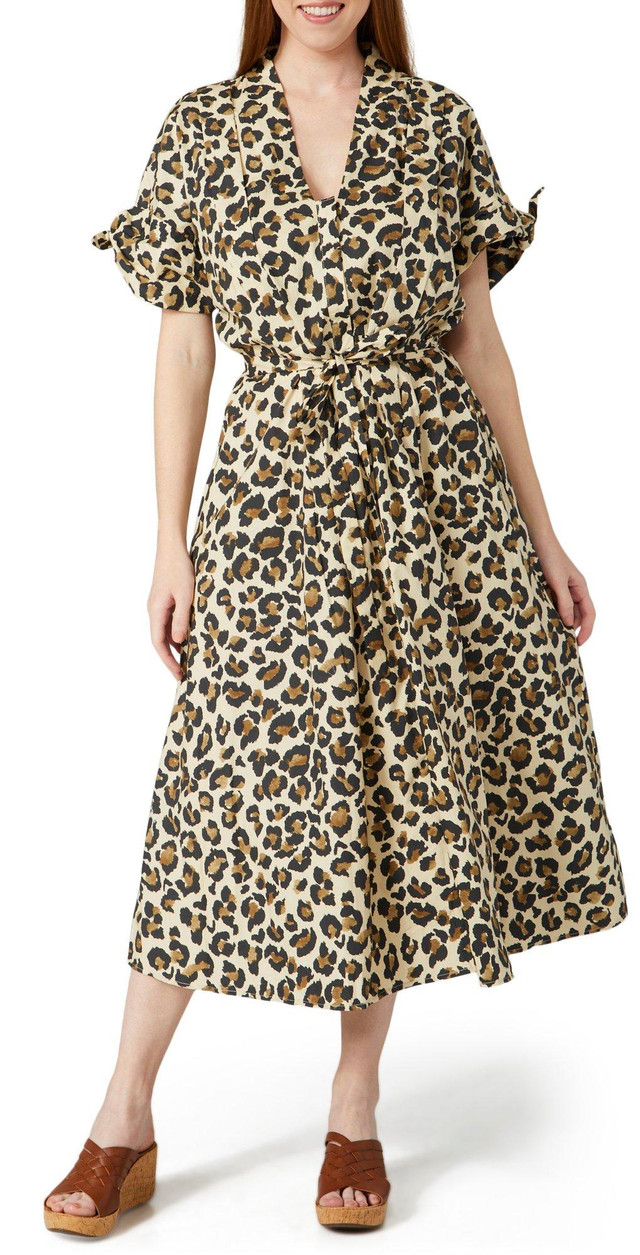 Introducing the Women's Short Sleeve Leopard Print Dress, crafted from 100% cotton for a comfortable and breathable fit. This dress features a bold leopard print, short sleeves, and a flattering v-neckline. The button-down front and included belt add a touch of sophistication, while the 48-inch length from shoulder provides a graceful and elegant silhouette. Perfect for any occasion, this dress combines modern style with timeless comfort.