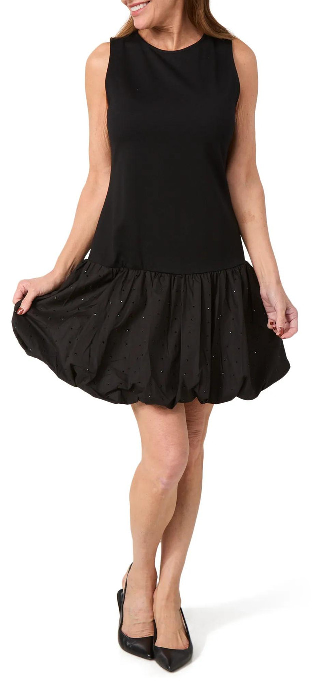 Step into the season in style with this sleeveless bubble skirt dress. Featuring a jewel neckline, back keyhole detail, and playful bubble hem with black stud embellishments, its a chic choice for holiday parties and festive nights out. Fabrication 65% polyester, 30% viscose, 5% spandex